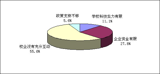 企業產學研開發體系難點方面的調查包括學校科技實力有限、企業資金有限、校企沒有充分互動、政策支持不夠等四個方面。本次調查中,認為學校科技實力有限的企業占11.1%;認為企業資金有限的企業占27.8%;認為校企沒有充分互動的企業占55.6%;認為政策支持不夠的企業占5.6%。調查中發現,產學研合作雙方在合作理念、技術完善性、時效性方面難以統一認識而影響效果。高校院所的研發機制不能適應企業面向市場的快節奏要求;按院所要求,研發總投入或委托研發費用太高,企業難以承受。尤其是一些中小企業對此反映更多。
