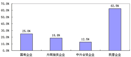 | 對于電源企業來說,民營企業依然占據產業的主體,所占比例為62.5%,國有企業為25.0%,位居第二。然后依次是外商獨資企業和中外合資企業,所占比例分別為18.8%和12.5%。電源行業還是較新的行業之一,發展也比較快,伴隨著市場經濟的發展,以電源行業逐漸以民營企業為主體。(見圖3) |