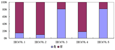 本次調查中涉及IEC478的標準包括:IEC478.1-1974《直流輸出穩定電源術語》,IEC478.2-1986《直流輸出穩定電源額定值和性能》,IEC478.3-1989《直流輸出穩定電源傳導電磁干擾的基準電平和測量》,IEC478.4-1976《直流輸出穩定電源除射頻干擾外的試驗方法》,IEC478.5-1993《直流輸出穩定電源電抗性近場磁場分量的測量》。其中企業對三號和五號標準更加偏愛,執行的比例分別為81.0%和82.0%。