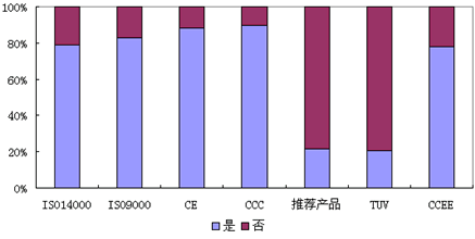 本次調查中涉及:ISO14000環境管理系列標準認證;ISO9000系列標準認證;CE認證;CCC認證;中國電源行業推薦產品標識認證;德國TUV認證;CCEE中國電工產品長城認證等。其中,只有德國TUV認證比例較小,其他都相對較高,超過80%。(見圖8)