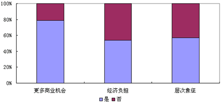 本次調查中涉及:執行認證會給企業帶來更多的商業機會;企業進行認證會成為企業的經濟負擔;企業進行相關認證是企業層次的一個象征等內容。結果顯示,認為會有更多商業機會的比例為78.9%,認為是經濟負擔的53.9%。認為層次象征為56.8%。(見圖9)