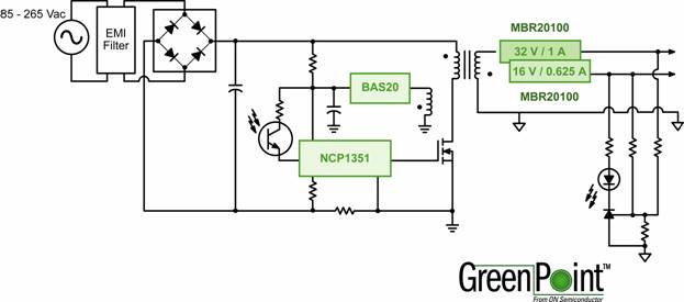 這個40 W參考設(shè)計中的關(guān)鍵器件為新推出的NCP1351,這是一款針對低功耗離線反激開關(guān)電源(SMPS)設(shè)計的電流模式控制器,基于固定峰值電流技術(shù)(幾近固定Ton),這個控制器會在負(fù)載變低時降低開關(guān)頻率,因此采用NCP1351的電源自然可以提供卓越的空載功耗,同時也能夠在其他負(fù)載情況下達(dá)到最佳的能效表現(xiàn),當(dāng)頻率下降時,峰值電流會逐漸降低到最大峰值約30%以避免變壓器發(fā)生機(jī)械振蕩,因此可以巨幅降低發(fā)生可聽見噪聲的風(fēng)險,并保持良好的待機(jī)能耗表現(xiàn)。