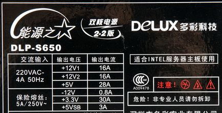 多彩 DLP-S650的+12V輸出為兩路設計,+12V1輸出為16A,+12V2與之相同,也達到了16A。從產品銘牌我們還看到了3C的S&E 標,說明產品同時通過了3C認證的安全與電磁兼容認證。此外,我們還看到+5VSB的電流輸出達到了3A,高于2.2版規定的2.5A。