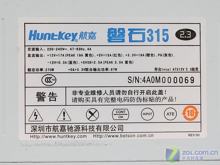 電源的銘牌是我們了解電源的一個窗口,好的電源銘牌在各個參數指標的標注上都會很清晰。航嘉磐石315的銘牌非常規范,3C認證、額定功率、各路輸出、電源版本等都赫然顯示在銘牌上。新2.3規范中300W以下功率級都是單路+12V,所以這款電源只有單路+12V輸出17A,額定功率為270W。