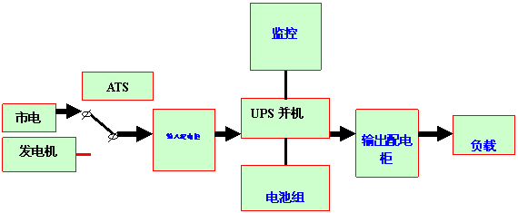 為了滿足用戶的需求,承擔著IDC機房供電任務的整個電源系統都必須采用具有高度容錯功能的并聯冗余供電方案,為了使整個系統負載供電方便,提供了輸出配電柜,方便更多的分路及遠距離連接。同時在整個系統中增加了UPS的監控部分,使整個系統更加智能化,使臺達C系列UPS的智能化特點能夠充分發揮,用戶可以非常方便的了解UPS運行的各項參數。