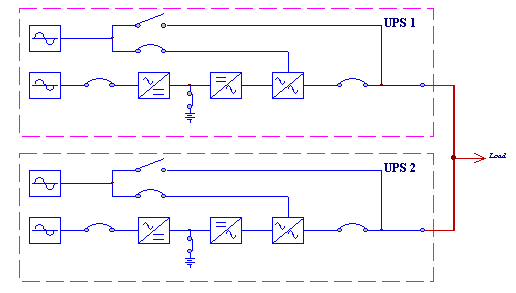 整個系統配置(如圖一),此次采用2臺臺達模塊化C系列80KVA,該UPS具有輸入高功率因數>0.99,非常小的輸入電流諧波<3%,降低了輸入諧波損耗,整機效率>94%,真正響應了節能降耗的號召,此次采用UPS并機實現并聯(1+1)冗余方案,同時每臺UPS具有模塊3+1冗余,極大的提高系統冗余度及可靠度,可靠性為單機UPS的7~10倍,(如圖二),整體方案具有先進的管理性,節省能源,極高的可靠度及實用性強等特點。