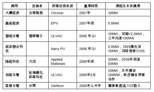 IEK產業分析師王孟杰指出,大同集團旗下的太陽能硅晶圓廠綠能科技,與美商應用材料(Applied Materials)簽約合作投資硅薄膜太陽能電池廠,期望在太陽光電產業的熱力影響下,以其硅晶圓的事業基礎及同集團的華映的經驗做跳板,向未來極具潛力的產品發展;除此之外,一些光盤片廠商,如浩瀚數字、訊碟科技及中環等廠商,也陸續宣布投入這個產業,臺灣的薄膜太陽能電池產業已經逐漸升溫。