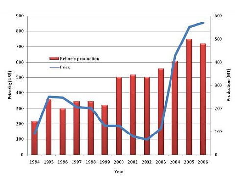王孟杰指出,目前臺灣地區已有頂晶等模塊廠,雖然規模不大,但未來擴產加上薄膜太陽能電池的需求上升,這些材料的供應吃緊也是可以預期;TCO更由于是LCD面板的共通材料,是否會使得TCO價格飆漲也是個觀察重點,尤其是近年來銦價因LCD面板在ITO的大量需求而漲了將近十倍之多(參考下圖),對于標榜低成本的薄膜太陽能電池是一個很大的考驗。
