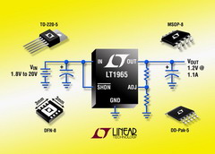 凌力爾特(Linear Technology Corporation)推出具有高功率密度的低噪聲、低壓 1.1A LDO LT1965。LT1965 在滿負載時具有僅為 300mV 的低壓差,并具有 1.8V 至 20V 的寬 VIN 能力和 1.2V 至 19.5V 的低可調輸出。僅為 40uVRMS 的超低輸出噪聲降低了儀表、射頻、DSP 和邏輯電源系統中的噪聲,并有益于后穩壓開關電源。在整個電壓、負載和溫度變化范圍內,輸出容限嚴格調節在 ±3% 之內。該器件的 500uA(工作時)和低于 1uA(停機時)的靜態電流使其非常適用于需要高輸出驅動能力和低電流消耗的應用。