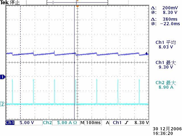 圖四給出了AP384XC在短路模式下的工作波形。從此圖可以看出在可靠打嗝工作模式下,輸入平均功率很容易被限制到可以接受的水平。