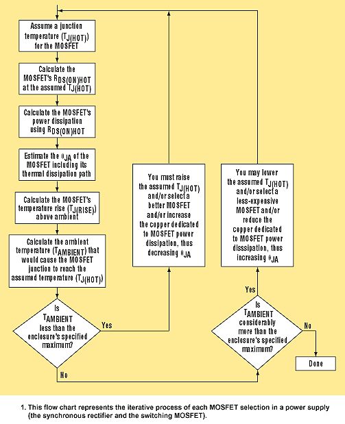 這一過程從首先假設各MOSFET的結溫開始,同樣的過程對于每個MOSFET單獨進行。MOSFET的功率耗散和允許的環境溫度都要計算。