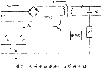 如圖2所示,當開關管轉為“關”時,集電極與發射極間的電壓快速上升達500 V,他產生的電流經集電極與地之間的分布電容返回整流橋,這個按開關頻率工作的脈沖串電流是共模噪聲。這個電壓會引起共模電流Icm2向CP2充電和共模電流Icm1向CP1充電,其中CP1為變壓器初、次級之間的分布電容,CP2為開關電源與散熱器之間的分布電容(即開關管集電極與地之間的分布電容)。則線路中共模電流總大小為Icm1+Icm2。如圖3所示,當開關管轉為“開”時,儲能電容Cs的能量由AC電網和整流橋提供,他被開關管變換器的快速開關頻率所變換,并通過變壓器形成脈沖電流IL,他具有非常豐富的開關頻率諧波。儲能電容不是一個純電容,他有串聯電阻和電感。當整流橋處開關管“開”時,在AC電網端,IL會產生一個由電容的L,R,C所呈現的阻抗電壓,這就是開關電源產生差模發射源的原理。差模電流Idm和信號電流IL沿著導線、變壓器初級、開關管組成的回路流通。