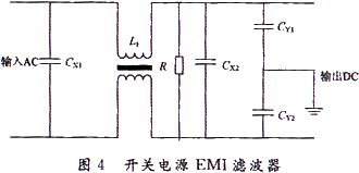 濾波是抑制傳導干擾的一種很好的辦法。在電源輸入端接上濾波器,即可以抑制開關電源產生并向電網反饋的干擾,也可以抑制來自電網的噪聲對電源本身的侵害。開關電源的工作頻率一般在10~130 kHz,對開關電源產生的高頻段EMI信號,只要選擇相應的去耦電路或網絡結構較為簡單的EMI濾波器,就能達到理想的濾波效果。干擾抑制電路如圖4所示,CX1和CX2叫做差模電容,L1叫做共模電感,CY1和CY2叫做共模電容。電阻R用于消除可能在濾波器中出現的靜電積累。IEC-380安全技術條件標準的8.8部分指出,若CX>0.1 μF則R=t/2.2C(t=1 s,C=2CX μF)。由這些集中參數元件構成無源低通網絡,抑制開關電源產生的向電網反饋的傳導干擾,同時抑制來自電網的噪聲對開關電源本身的侵害,為了使通過濾波電容C流入地的漏電流維持在安全范圍內,CX=0.1~0.2 μF ,CY的值一般適合取在0.1~0.33μF之間,不宜過大,相應的扼流線圈L應選大些,一般適合取在0.5μH~8 mH之間,這樣既符合安全要求,又能抑制電磁干擾。