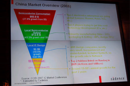 他表示目前本土IC設(shè)計公司在數(shù)字IC設(shè)計上進(jìn)步很快,已經(jīng)迫使很多歐美公司正逐步撤離這個領(lǐng)域,而Cadence也注意到,這些歐美公司更關(guān)注混合了模擬和數(shù)字IC的SoC設(shè)計,所以Cadence會加強SoCEDA工具的功能。針對模擬IC設(shè)計,他表示因為模擬IC要基于經(jīng)驗的積累,所以Cadence會投入巨資加強模擬IC設(shè)計工具自動化的提升。他透露目前Cadence每年投入到工具開發(fā)方面的資金占了全年總收入的30%以上,這個比例遠(yuǎn)高于一些半導(dǎo)體公司如Intel和三星電子等。