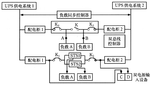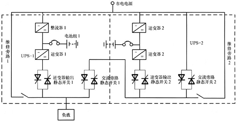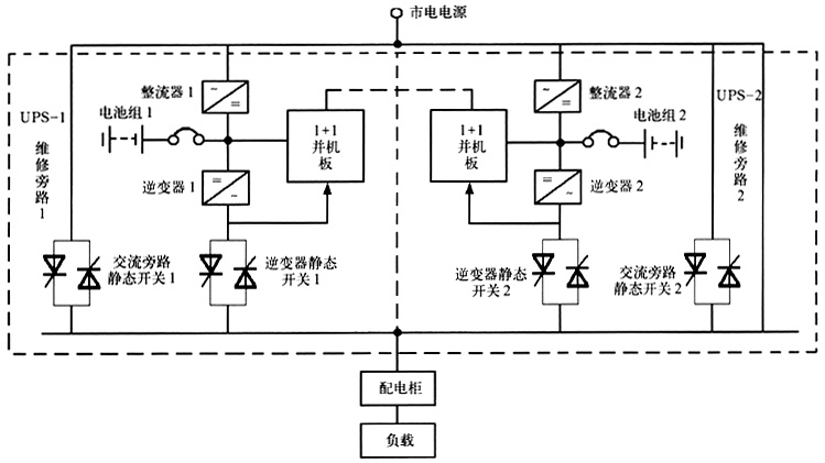 此種冗余供電方式的優點為對UPS單機的鎖相同步跟蹤控制技術要求不高(僅在兩臺UPS進行切換瞬間有所要求),熱備份冗余供電系統構成容易、簡單。缺點為長期空載運行的其中一臺UPS的配套蓄電池壽命縮短;由于一臺帶全載,另一臺空載,造成平均無故障時間下降;并要求單機具有帶“階躍性負載”的能力來保障主機出故障后能將全部負載立即加到空載運行的從機上。由于從機長期處于空載運行狀態,一旦出現切換過程,負載量將由0突變至全部負載,內部電路及元器件由于大電流的沖擊,易造成損壞,使UPS的不安全運行穩定性增高。