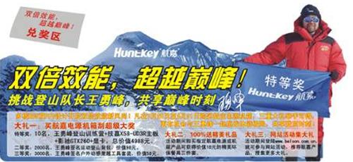 加入王勇峰登山訓(xùn)練營,共享巔峰時刻,航嘉2009大型暑假促銷活動即將開幕!凡在7月20日至8月31日購買航嘉指定電源機箱產(chǎn)品,就有機會零距離挑戰(zhàn)國家登山隊長王勇峰,現(xiàn)場接受王勇峰專業(yè)的登山訓(xùn)練指導(dǎo),挑戰(zhàn)體能極限,共享登頂時刻!