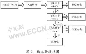 當電池進行充電時,電池電壓采樣電路立刻對電池的端電壓進行循環的掃描,將采樣得到的端電壓信號送人到PIC16C73B的一路AD口進行轉換,單片機根據電池當前的狀態決定采用何種方式對電池充電。控制過程框圖如圖2所示。