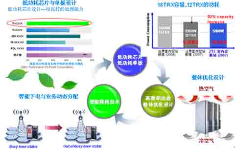 中興通訊PowerSpeed方案主要包括以下關鍵技術,綜合目標是達到最佳服務/付出比=載頻數X每載頻輸出功率/(每平方米*每瓦特功耗):