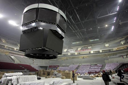 12月26日,國內(nèi)首套全彩高清LED顯示系統(tǒng)落戶奧運五棵松籃球館。目前,這套顯示系統(tǒng)已安裝就位,正在加緊進行調(diào)試。2007年12月27日,全彩高清LED顯示系統(tǒng)在五棵松奧運籃球館安裝完畢,為滿足奧運會及賽后NBA籃球比賽的需要,這套系統(tǒng)由漏斗屏、環(huán)形屏及計時記分控制系統(tǒng)三部分組成,凈高9.042米,最大直徑約為11米,重22噸。