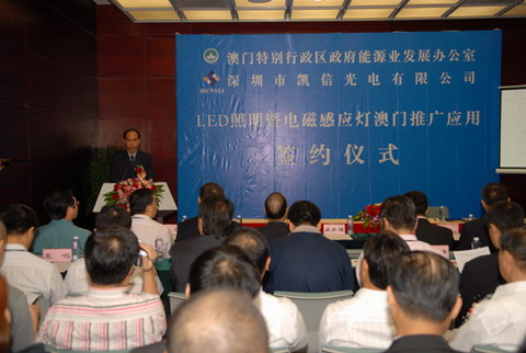 2008年10月12日,澳門特別行政區能源業發展辦公室與深圳市凱信光電有限公司關于在澳門推廣應用凱信光電節能產品的簽約儀式在深圳高交會館舉行。