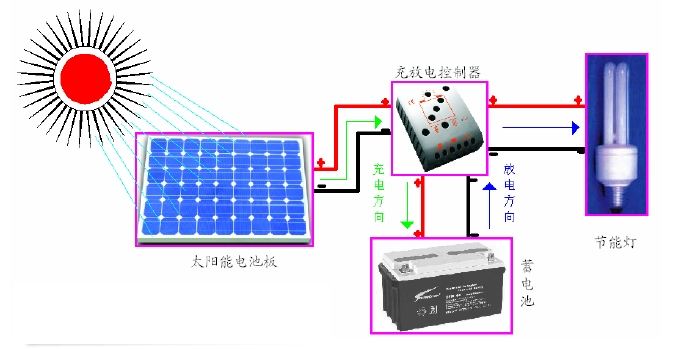 系統工作原理簡單,利用光生伏特效應原理制成的太陽能電池白天太陽能電池板接收太陽輻射能并轉化為電能輸出,經過充放電控制器儲存在蓄電池中,夜晚當照度逐漸降低至10lux左右、太陽能電池板開路電壓4.5V左右,充放電控制器偵測到這一電壓值后動作,蓄電池對燈頭放電。蓄電池放電8.5小時后,充放電控制器動作,蓄電池放電結束。充放電控制器的主要作用是保護蓄電池。