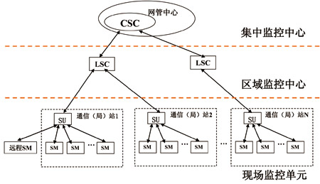 動力環境集中監控管理系統應采用逐級匯接的三級網絡拓撲結構,由集中監控中心(CSC)、區域監控中心(LSC)和現場監控單元(FSU,監控設備)組成,如圖1所示。同時,本監控系統還應滿足與其它網管、綜合網管系統互聯的要求。