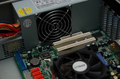 主板的安裝和普通機箱一樣,這里就不贅述了。但是筆者在這里注意到一個地方,就是電源的風扇罩略微有些外凸,有點抵住了主板下部的PCI槽,不過用鉗子稍微調整一下就沒問題了。因為筆者手上只有一款M-ATX主板,所以無法測試是不是其他主板也會被風扇罩抵住。