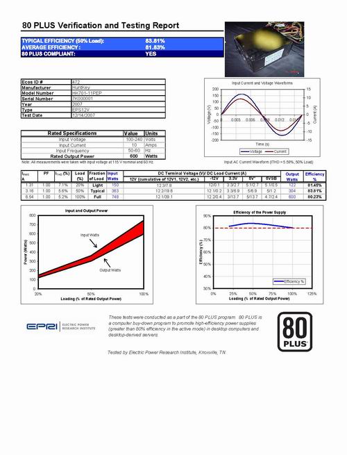 80PLUS認證表明:磐石800在20%負載,典型負載和滿載下的轉換功率分別可達到81.45%、83.81%、80.23%,也就是說,完全符合80PLUS規范。