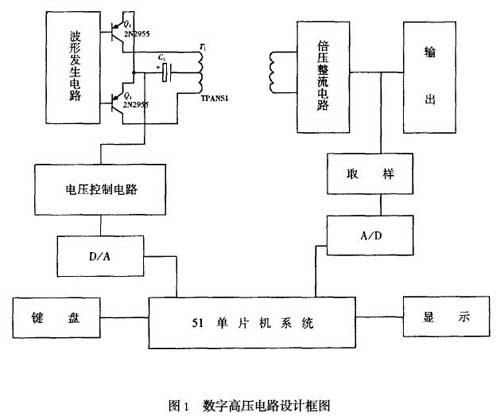 方案的原理與系統框圖如圖1所示。電路由兩個PNP型三極管構成推挽型開關電路,波形發生電路產生兩個幅度相等、相位相反的方波,分別加在兩個開關管的基極,使得兩個三極管輪流導通。當開關管導通的瞬間在Q、C、T組成的回路中產生一個很大的電流,根據楞次定律,由于電感兩端電流不能突變,使變壓器次極產生感應電壓,這樣初級的能量通過變壓器傳送到了次極,由于變壓器是升壓型,這樣次極電壓高于初級,經倍壓整流達到設計所要求的電壓。取樣電路和鍵盤輸入數據通過單片機處理后,經DPA轉換調節電壓控制電路,使變壓器初級電壓大小發生變化,從而使得輸出電壓也相應的發生變化,達到所需要的電壓值。