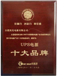合肥陽光此次成功獲得2007年中國電源產業UPS電源“十大品牌”的榮譽稱號,表明其綜合實力正在穩步增強,一流的研發力量及過硬的產品質量越來越多地被社會各界及廣大客戶所知曉、認可。