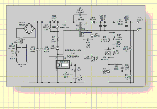 U2構成了輸出反饋回路,它的偏置點通過TL431并聯(lián)調節(jié)器U3來設置,R10和C36對反饋網絡提供了補償。R27和C35形成的網絡用于提高相位容限,當光耦合器U2A不導通時,R9為并聯(lián)調節(jié)器U3提供偏置電流。R26決定了整個環(huán)路增益,并且限制了U2A上的瞬態(tài)電流。