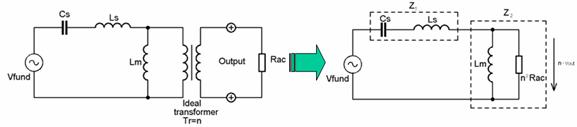 這其中,Z1和Z2與頻率有關,由此可知LLC轉換器的行為特性類似于與頻率有關的分頻器,負載越高,勵磁電感Lm所受到的由交流電阻Rac產生的鉗位作用就越大。這樣一來,LLC儲能電路的諧振頻率就在Fs和Fmin之間變化。在使用基波近似時,實際的負載電阻必須修改,因為實際的諧振回路是由方波電壓驅動的。