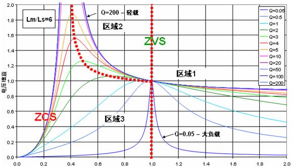 圖4:標準化增益特性(區域1和區域2為ZVS工作區域,區域3為ZCS工作區域)