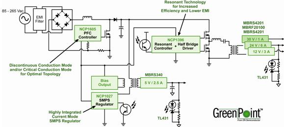 圖6:采用NCP1396A的安森美半導體GreenPointTM 220瓦液晶電視電源參考設計。