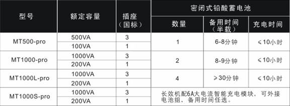 為了滿足不同用戶對UPS后備時間需求,新MT-pro系列分為三種型號:標準型(MT500-pro/MT1000-pro)、延時型(MT1000L-pro)和長效型(MT1000S-pro)。