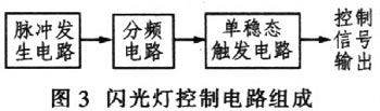 控制電路需要根據不同的要求進行不同的設計。對于閃光功能變化復雜的控制電路可使用MCU單片機進行控制,這樣控制方便、簡單、穩定。由于本系統設計只要求閃光燈定時閃爍,功能單一,故采用簡單的純硬件電路實現。電路組成如圖3所示。