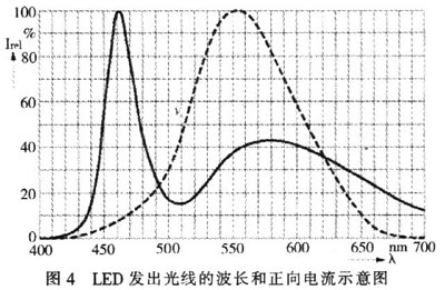 白光LED設計中采用了一個小竅門。在發射藍光的InGaN基料上覆蓋轉換材料,這種材料在受到藍光激勵時會發出黃光。于是得到了藍光和黃光的混合物,在肉眼看來就是白色的,圖4為LED發出光線的波長和正向電流示意圖。由圖4可以看出:白光LED的發射波長(實線)包括藍光和黃光區域的峰值,但是在肉眼看來就是白色。肉眼的相對光敏感性(虛線)如圖4所示。
