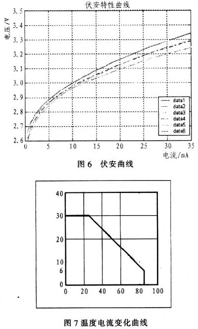 圖6和圖7分別為LED的伏安曲線和溫度電流曲線。由LED發光原理可以知道,白光LED的亮度變化主要是由其通電電流決定的。