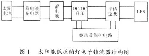 太陽能低壓鈉燈電子鎮流器是由太陽電池陣列來供電,由于太陽電池陣列具有非線性的電源特性,為保證陣列在任何日照和環境溫度下都將提供相應可能的最大功率輸出,因此,要求鎮流器白天能自動跟蹤最大功率點給蓄電池充電,晚上經光控元件檢測太陽電池電壓和定時器件來決定是否自動點亮低壓鈉燈。