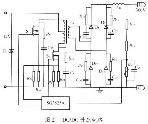 如圖2所示,DC/DC驅動芯片采用美國硅通公司生產的電壓型PWM控制器SG3525A,SG3525A是一種性能優良,功能齊全,通用性很強的單片集成PWM控制器,該芯片簡單可靠且使用方便靈活,通過外接適當電路,不僅能夠實現PWM控制,還可以完成輸入軟啟動、過載限流、欠壓保護、死區調節等多種功能。