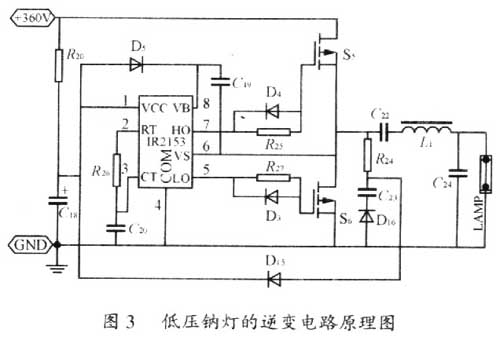 如圖3所示,其工作原理為:經前級升壓電路得到直流360V電壓,啟動時經R20向電容C18充電,當充到IR2153的啟動電壓時,芯片正常工作,產生PWM波來驅動兩只MOSFET,使之輪流導通與截止,在其中心點VS(腳6)輸出幅度約為直流電壓的一半,即360V/2,其占空比約為50%的方波信號,經電感L1及電容C22和C24給燈管提供啟輝信號。S6導通時,VCC通過自舉二極管D5對自舉電容C19充電,使VB(腳8)電壓比H0(腳7)電壓高出VCC,為lC內部高端驅動級提供直流電源。接于腳6的R24、C23串聯網絡起阻尼作用,可以減小方波輸出前沿的噪聲輻射,也有對S5、S6的續流作用。同時它將半橋中點電壓通過D15、D16整流,供給IR2153的VCC(腳I)直流電壓,不再由R20降壓供給,以減小功耗。