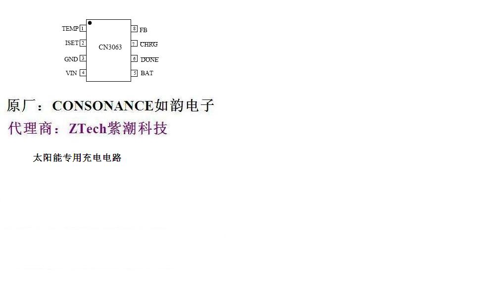 CN3063是可以用太陽能電池供電的單節鋰電池充電管理芯片。該器件內部包括功率晶體管,應用時不需要外部的電流檢測電阻和阻流二極管。內部的8位模擬-數字轉換電路,能夠根據輸入電壓源的電流輸出能力自動調整充電電流,用戶不需要考慮最壞情況,可最大限度地利用輸入電壓源的電流輸出能力,非常適合利用太陽能電池等電流輸出能力有限的電壓源供電的鋰電池充電應用。
