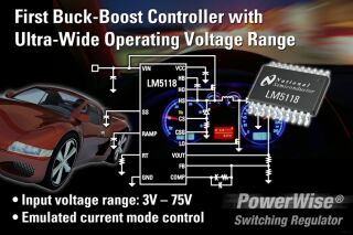 美國國家半導(dǎo)體LM5118開關(guān)穩(wěn)壓器具備組建高效率降壓/升壓穩(wěn)壓器的一切必要功能,且只需極少外置元件。降壓/升壓拓?fù)涞膬?yōu)點是無論輸入電壓低于還是高于輸出電壓,穩(wěn)壓器都可輸出穩(wěn)定的電壓。因此這款芯片尤其適用于汽車電子系統(tǒng)。