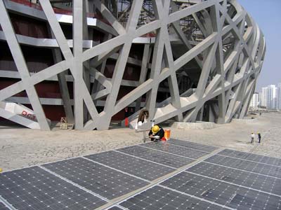 該工程首次采用的綠色能源—太陽能光伏并網發電系統,總裝機容量為100千瓦,采用我公司最新研發的5KW并網逆變器,產品安裝在“鳥巢” 中包括主門在內的七個進出口門的入口處,其技術要求達到國際領先的水平。我公司與無錫尚德公司合作,通過激烈的竟爭,最終以較高的性價比及擁有較多的成功業績而中標,并成為該系統的唯一供應方,安裝運行后,對“鳥巢”的電力供應將起到良好的補充和示范作用。