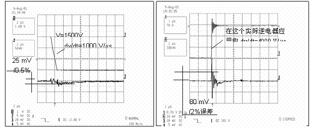 開關設備每次開關時產生的高dv/dt值將在主電纜和傳感器的電子電路之間產生電容電流。大多數模擬線性放大器對這種寄生電流很靈敏。因此,dv/dt噪聲將被疊加在輸出信號上。根據變動電壓的幅度和斜坡,初始尖峰和后來的振蕩有時會非常高,以致它們會激活傳感器的電流保護電路,進而使逆電器暫停運轉。LEM的經驗在HX系列設計階段幫助保證了對關鍵噪聲的完美免疫力,而又不會損害帶寬,因此HX的性能要超過其它類似的傳感器(圖2和圖3)。