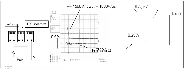 對階躍電流的超快速響應時間對IGBT短路保護必不可少。HX系列可以以50A/ms以上的速度,準確追蹤電流變化,對階躍電流的響應最快為3ms。