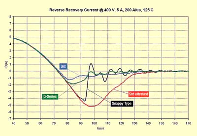 在硅二極管的設計過程中可以采用多種技術控制器件中少數載流子的壽命,但是迄今為止還無法匹配SiC二極管的低QRR。如圖2中的綠色曲線所示,最新的硅器件——Qspeed半導體公司的Q系列——能夠實現與SiC肖特基器件同樣低的IRR(如圖2中的藍色曲線所示)。