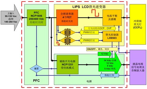 圖2:安森美半導體針對32英寸液晶電視的全橋高壓LIPS解決方案功能框圖。