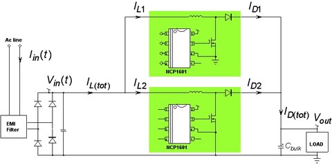 圖3:采用兩顆NCP1601 PFC控制器實現的交錯式PFC架構的功能框圖。