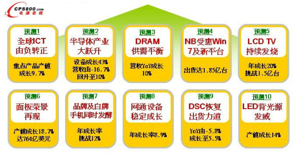隨著中國市場需求強勁及歐美市場逐漸復蘇,DRAM市場趨于供需平衡,預估2010年上半年淡季將向下修正,但Windows 7效應則將在2010年中明顯發酵,帶動DRAM ASP再度上揚,2010年價格將出現小漲狀況。無獨有偶,大尺寸面板在NB丶TV市場快速成長,以及產能獲得有效控制影響下,預計2010產值年成長率將達到18.7%,供需也將趨于穩定,逐漸恢復2008年的榮景。
